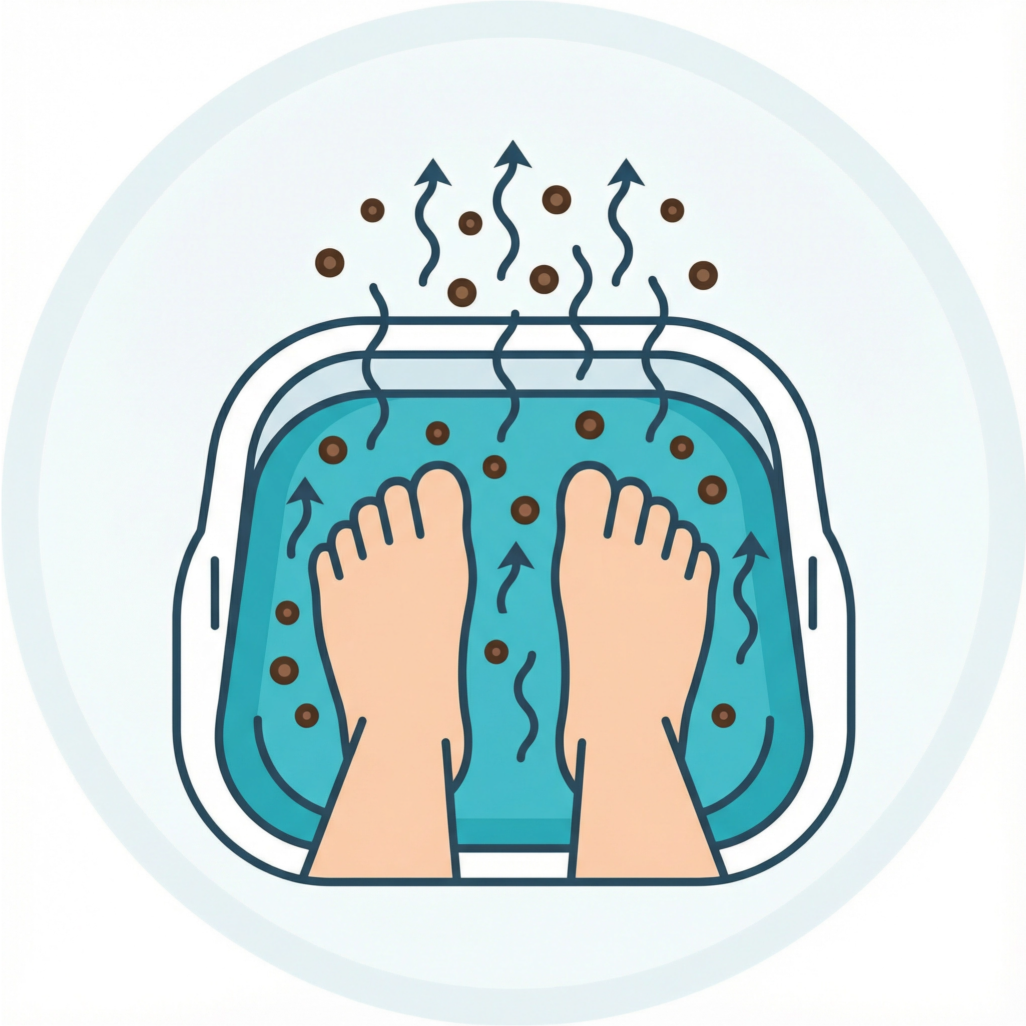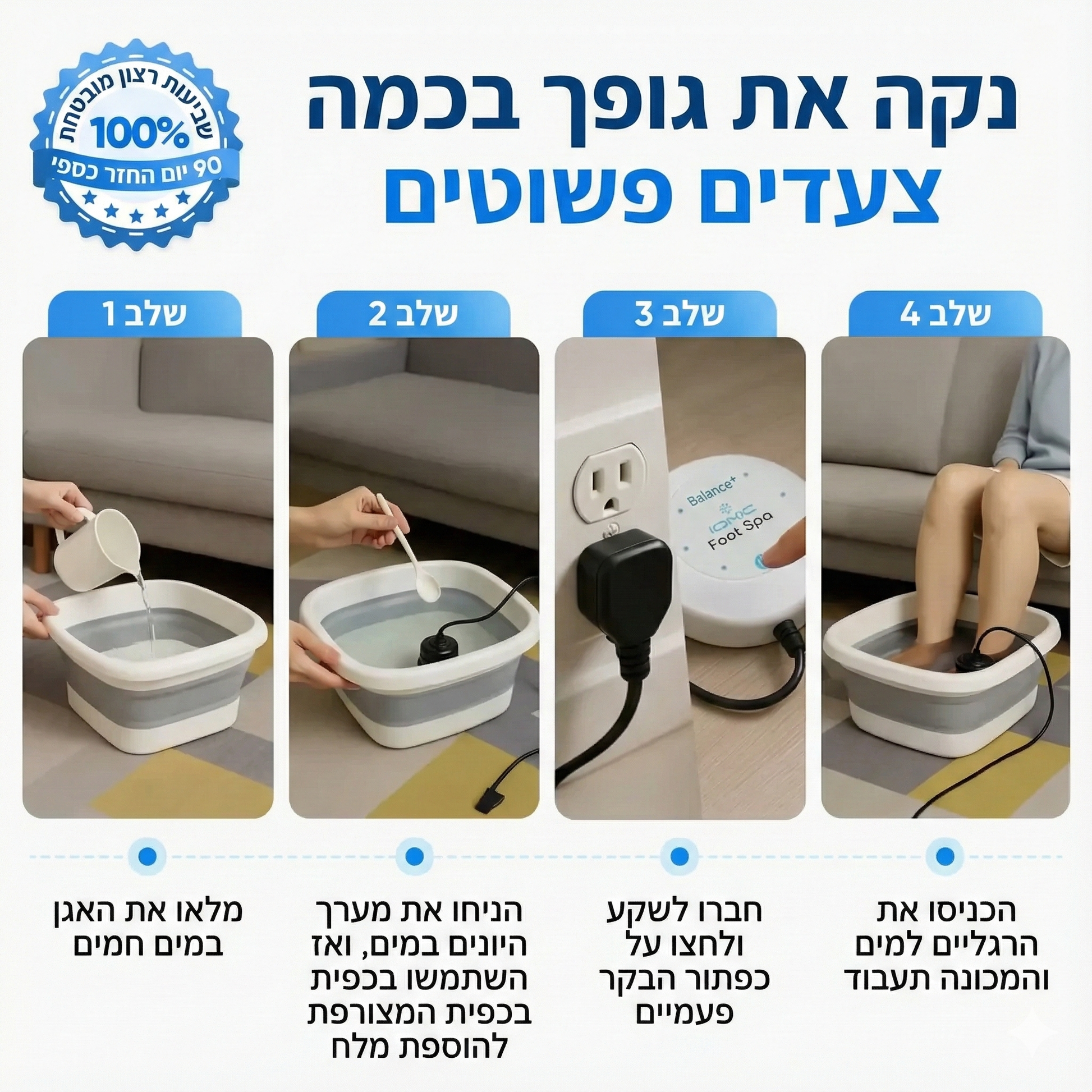 השימוש פשוט מאוד: מניחים את סליל הטיפול בתוך הגיגית עם מים חמים, מוסיפים קמצוץ מלח (לשיפור המוליכות), מכניסים את הרגליים ומפעילים את המכשיר. אין צורך בציוד מיוחד – כל גיגית ביתית תתאים.